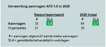 Hieronder de gemiddelde afhandeling van AFD (aan-)vragen in werkdagen (“Service Level Agreement”). De SLA’s zijn afgezet tegen het aantal AFD (aan)vragen per unieke organisatie in de actuele releasemaand en over 2026 totaal. Bijgewerkt met de AFD release van 1-4-2026.